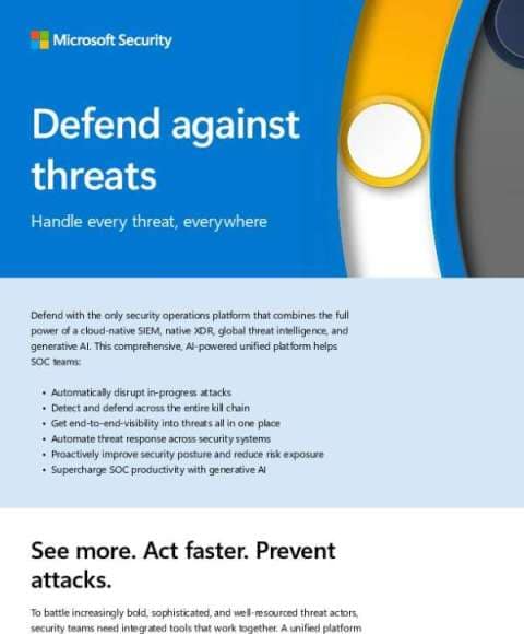 One platform. Full coverage. 🙌 Defend smarter with built-in SIEM, XDR, threat intel, and generative AI. Download the infographic to see how @Microsoft Security brings it all together, and message us for a consultation.