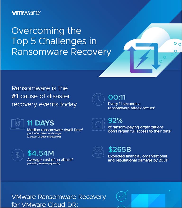 Ransomware is expensive. The average cost of an attack is $4.5 million. Worse, nine in ten organizations that pay ransom to get their data back never do. Read this infographic on the top five challenges in ransomware recovery to find out what steps you can take to protect your systems.